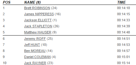 The race itself is 4-and-a-bit laps of a 1200m circuit that’s really just 600m out, around a cone, and then back again. this makes it great for spectators, but also leads to lots of slowing as you navigate the hairpin turns. I knew I wasn’t going to set the world alight here but was hoping to be in the mix with my 4 training partners who were running. I started off reasonably steadily in about 15th place, and moved through the Racefield as the race went on. I probably shouldn’t have let Roffy and Jeff get away from me early on, as this isolated me a bit and meant I got the full breeze in my face for half of the loop. As things turned out, I moved into 8th place and was slowly gaining on Roffy and Jeff but couldn’t get close enough to challenge them. 8th place was where I finished, in 14.57. My Sydney Running Academy teammates all ran to form really – Nipper had a strong run for 2nd and young Jack Stapleton challenged well for 4th. Jeff, Roffy and myself all need a bit more training in our legs. Still, 5 in the top 8 for this Asics sponsored race makes the sponsors happy.