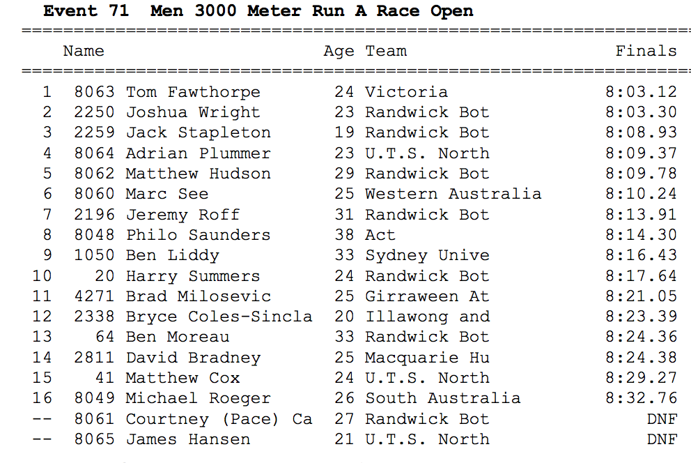 Sorry this is a week late, but y’know, I’m busy and a bit lazy, and I figured you weren’t all desperate to hear about my 13th place at the NSW StateNSW state 3k 2014 3k Champs. My comments on the race will be kept reasonably brief. Basically, I’m not fully fit, and 3,000m is too short for me without a few track sessions under my belt. I figured if I ran close to 8.15, I’ve done pretty well, but after 400m when I saw the lap split of 66 and how quick that felt, that I was going to struggle to achieve this. The lead group was already pulling away and would go on to run 8.03-8.09. My km splits went 2.45, 2.48, 2.51 and I struggled my way round to 13th place in 8.24. In previous years I have run 8.02 for 2nd (when fully track fit) and 8.09 for a win 3 weeks before my marathon PB in Fukuoka.